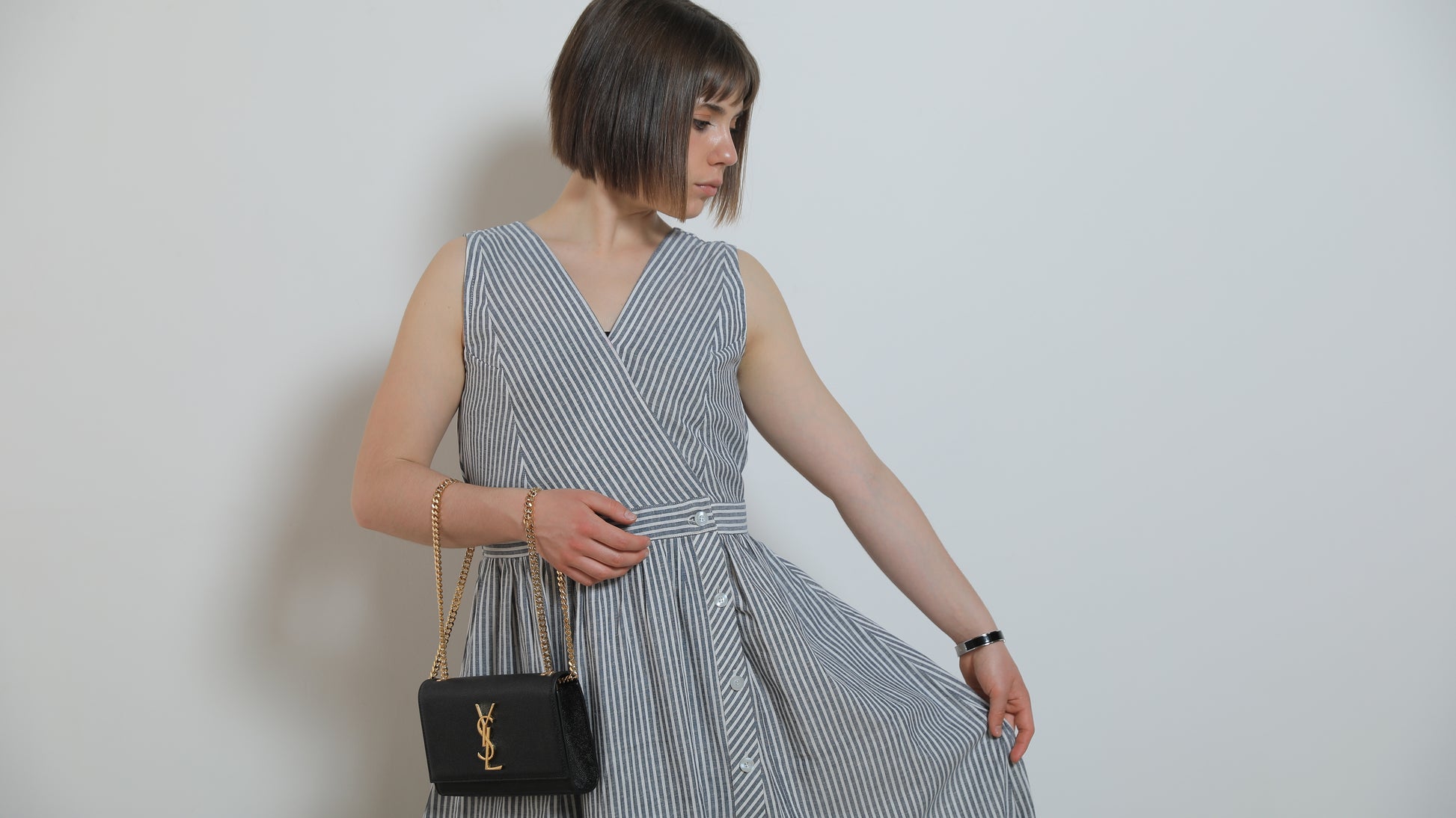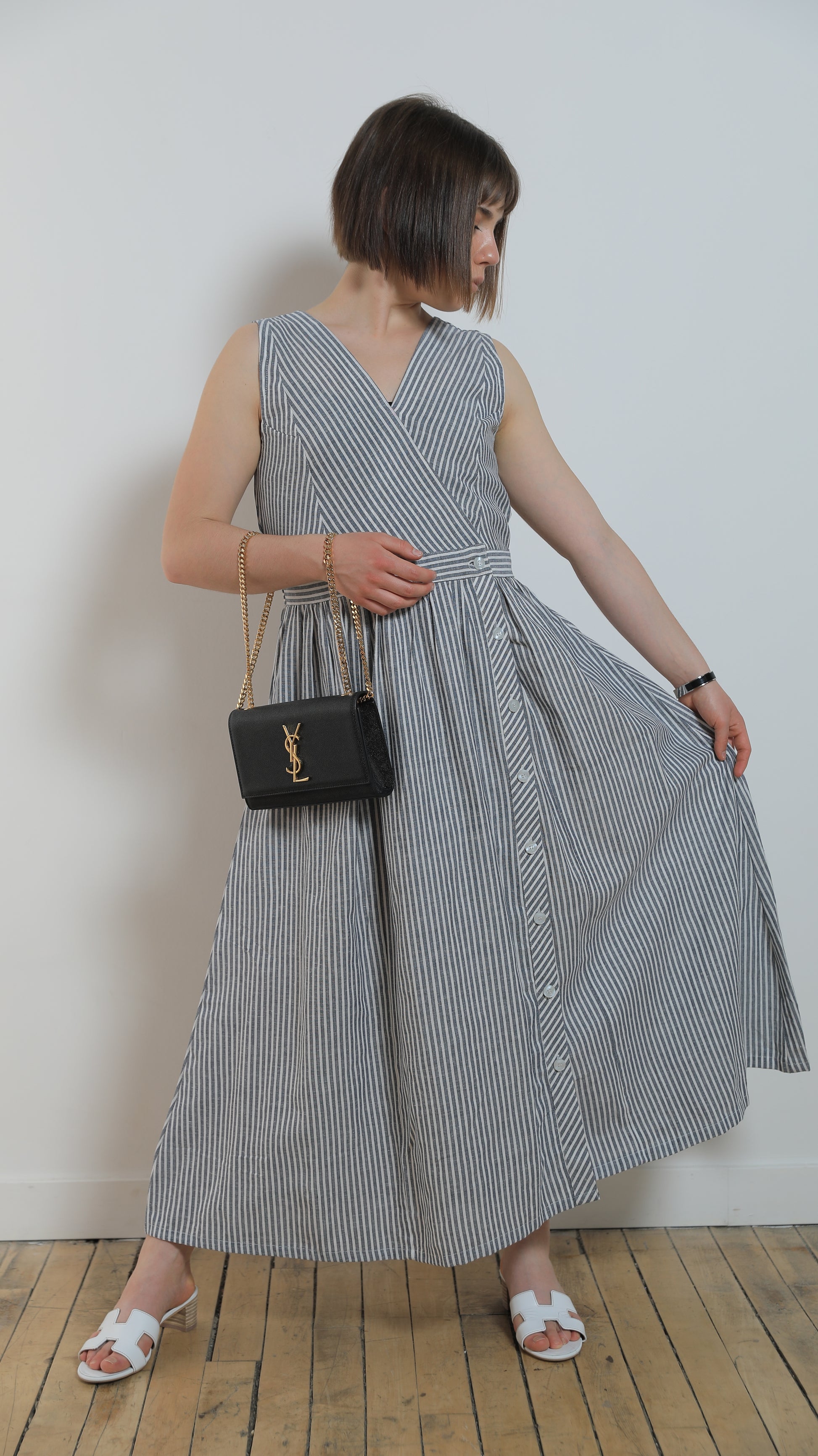 Introducing the "Brooklyn Linen Frock Dress" – a chic and comfortable outfit crafted from 100% high-quality linen with grey and white stripes. Its wrap design accentuates your curves, and the full buttons add a delightful detail. Versatile for any occasion, from casual to more formal settings, this dress offers both style and ease. Embrace modern sophistication and relaxed luxury with the Brooklyn Linen Frock Dress, perfect for all your adventures.