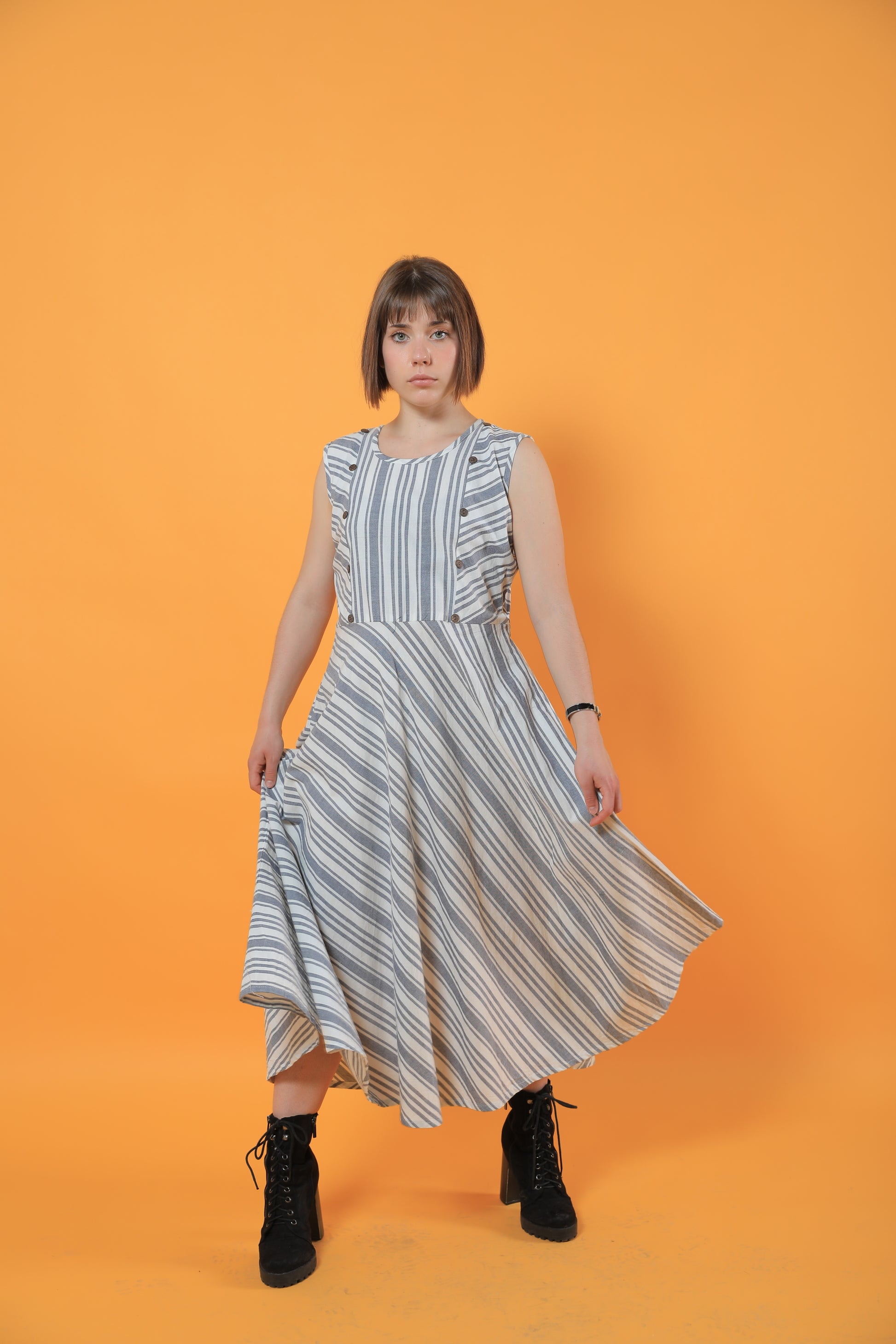 Introducing the elegant "Julie Pin Tucks A-line Linen Dress" in a rich navy blue hue. This dress boasts a flattering A-line silhouette with a full flare, exuding timeless grace and sophistication. The front open design features buttons that add a touch of chic detailing, while the full sleeves provide a classic and modest look. Crafted from high-quality linen, this dress ensures comfort and breathability, making it a perfect choice for any season. Elevate your style with the Julie Pin Tucks A-line Linen Dress, a versatile and effortlessly stylish addition to your wardrobe.